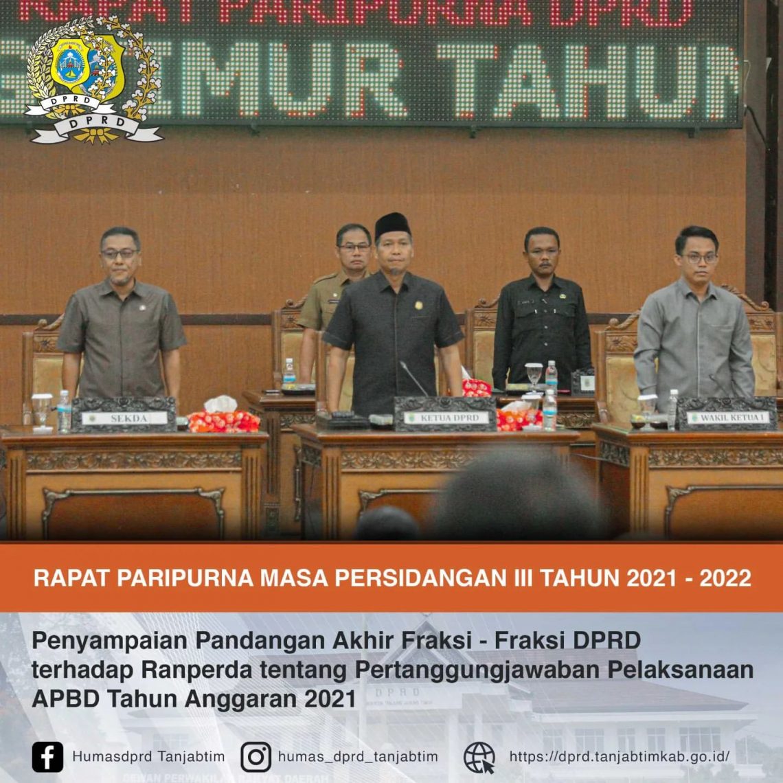 Secara umum lima Fraksi DPRD Kabupaten Tanjung Jabung Timur, diantaranya Fraksi PAN, Fraksi Golkar, Fraksi PDI – P, Fraksi BBI dapat menyetujui Ranperda Pertanggungjawaban Pelaksanaan APBD tahun 2021 dijadikan Peraturan Daerah, sedangkan Fraksi Restorasi Nurani Rakyat (RNR) tidak dapat menyetujui Ranperda Pertanggungjawaban Pelaksanaan APBD Tahun Anggaran 2021 untuk dijadikan Peraturan Daerah.