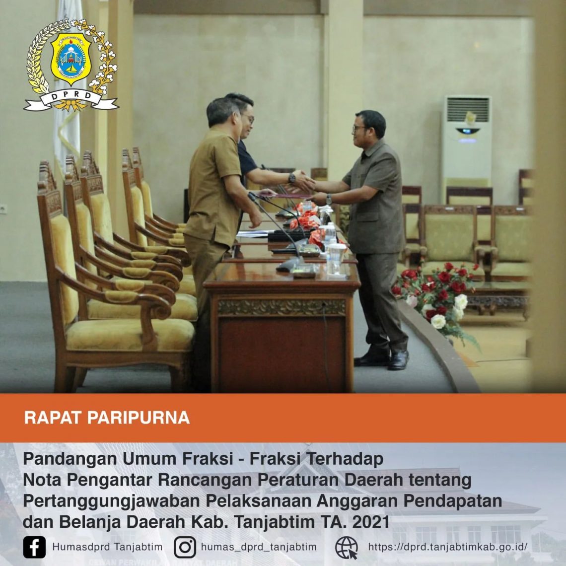 Muara Sabak – DPRD Kabupaten Tanjung Jabung Timur (Tanjabtim), kembali menggelar Rapat Paripurna dalam rangka mendengarkan Pandangan Umum Fraksi – Fraksi Terhadap Nota Pengantar Rancangan Peraturan Daerah tentang Pertanggungjawaban Pelaksanaan Anggaran Pendapatan dan Belanja Daerah Kab. Tanjabtim TA. 2021. Selasa (14/6/22).
