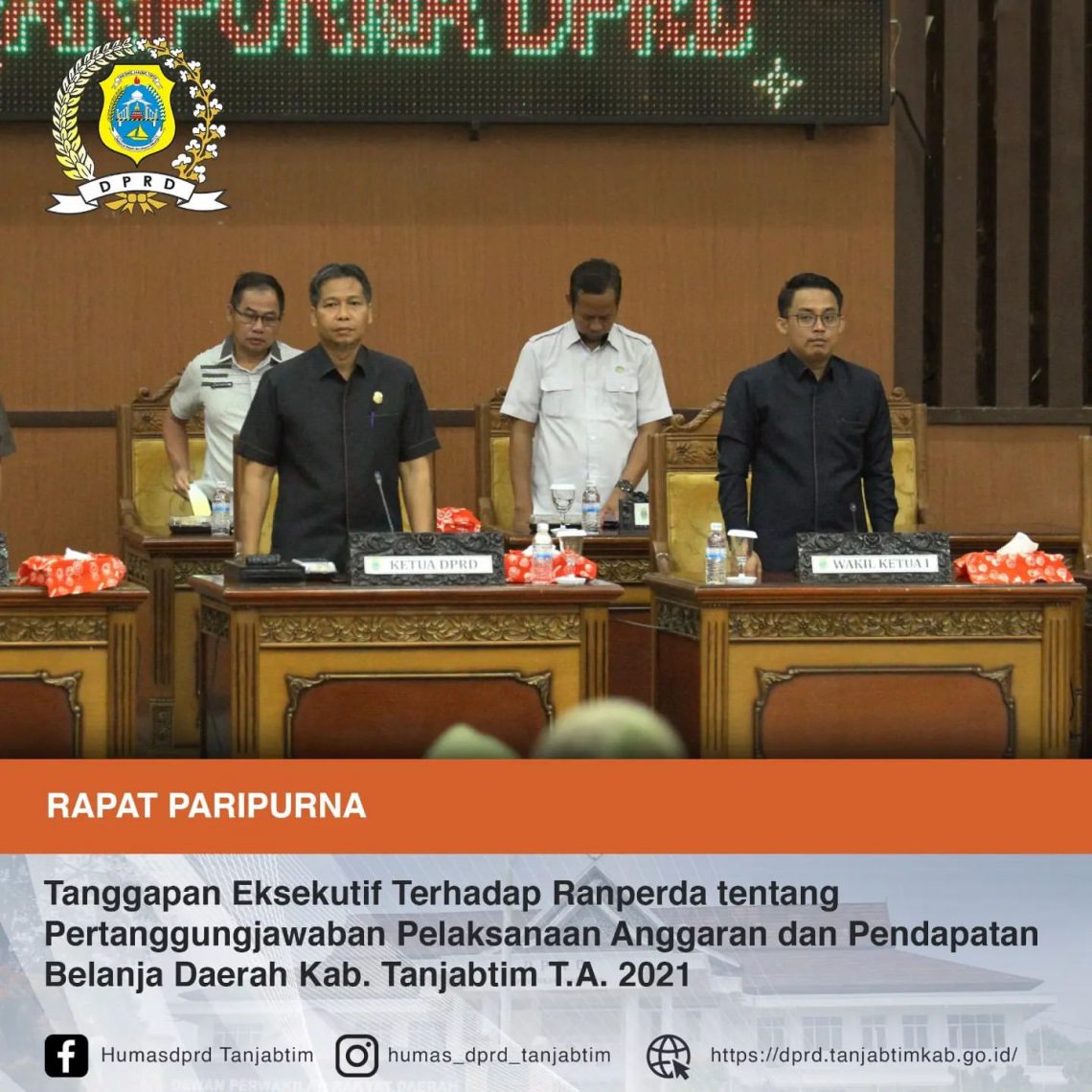 Tanjabtim – Ketua DPRD Kabupaten Tanjung Jabung Timur (Tanjabtim) Mahrup didampingi Wakil Ketua I Saidina Hamzah pimpin rapat Paripurna agenda Penyampaian Tanggapan Eksekutif atas Pemandangan Umum Fraksi – Fraksi DPRD atas Rancangan Peraturan Daerah tentang Pertanggungjawaban Pelaksanaan Anggaran Pendapatan dan Belanja Daerah Kab. Tanjung Jabung Timur Tahun Anggaran 2021. Rabu (15/6/2022).