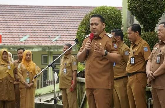 Bangko-Hari pertama masuk kerja pasca Lebaran Idul Fitri 1446 H, Bupati Merangin H M Syukur sekitar pukul 07.30 Wib mengambil apel di halaman depan Rumah Sakit Daerah Kol Abundjani Bangko, Selasa (08/4)