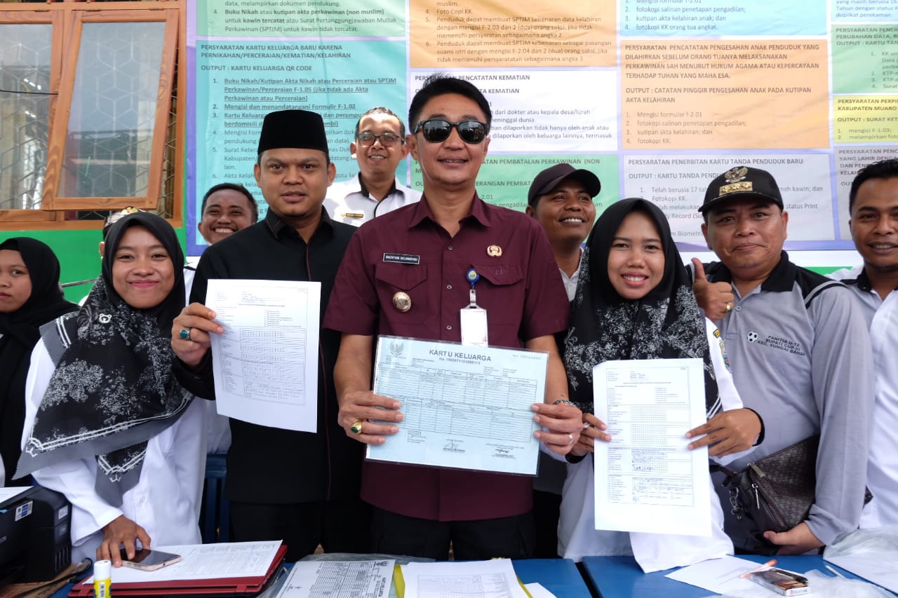 Muaro Jambi – Ketua DPRD Kabupaten Muaro Jambi Yuli Setia Bakti bersama Pj Bupati Bachyuni Deliansyah meninjau langsung proses perekaman e-KTP dari Dinas Dukcapil Muaro Jambi di Desa Bakti Mulya, Kecamatan Sungai Bahar, Rabu (20/9).