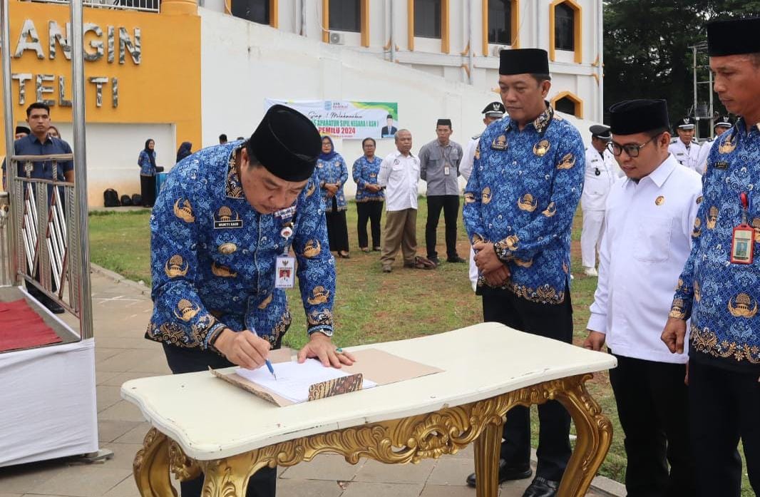 Bangko-Ribuan Aparatur Sipil Negara (ASN) di jajaran Pemkab Merangin berikrar ‘ASN Pilih Netral’, pada pemilihan umum dan pemilihan 2024. Ikrar netralitas ASN tersebut dipimpin Pj Bupati Merangin H Mukti pada apal kedisiplinan, Rabu (17/1).