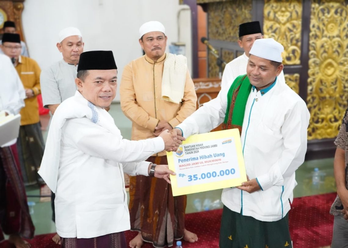 Bungo – Gubernur Jambi Dr. H. Al Haris, S.Sos., MH menyerahkan bantuan dana hibah Pemerintah Provinsi Jambi sebesar 270 juta rupiah. Bantuan ini terdiri dari dana APBD Pemerintah Provinsi Jambi dan dana Corporate Social Responsibility (CSR) Bank Pembangunan Daerah Jambi. Hal tersebut dilaksanakan pada acara Safari Ramadhan Pemerintah Provinsi Jambi bersama Pemerintah Kabupaten Bungo, bertempat di Masjid Agung Al Mubarak Kabupaten Bungo, Rabu (20/03/2024) malam.