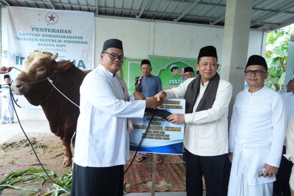 Setelah melaksanakan Sholat Idul Adha, Bupati Bambang Bayu Suseno menyerahkan bantuan satu ekor sapi dari Presiden Republik Indonesia, Prabowo Subianto, kepada Pengurus Masjid Daarul Hikmah untuk qurban pada Hari Raya Idul Adha 1446 H/2025 M. Bupati berharap qurban ini dapat menjadi jalan menuju ridha Allah SWT.