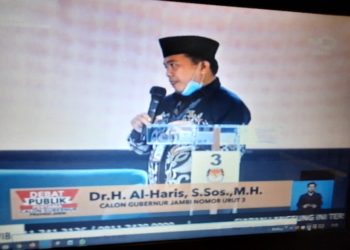 Jambi - Sepanjang debat kandidat Calon Gubernur Jambi Tahap 1, di Swiss Belhotel Jambi, Sabtu (24/10/2020), Al Haris tampak berhati-hati ...