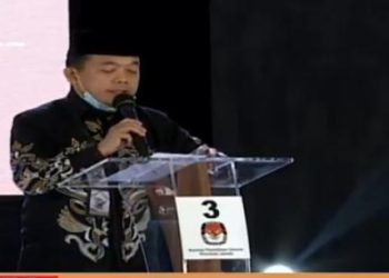 JAMBI—Calon Gubernur Jambi nomor urut 2 Fachrori Umar saat menyampaikan visi misinya dan program menyebut akan memperhatikan kesejehteraan guru mengaji ...