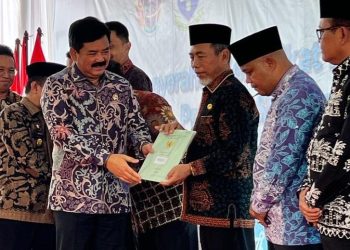 Bangko-Bupati Merangin H Mashuri menerima sertifikat hak pakai instansi, program strategis nasional, wakaf dan rumah ibadah dari Menteri ATR/BPN Hadi ...