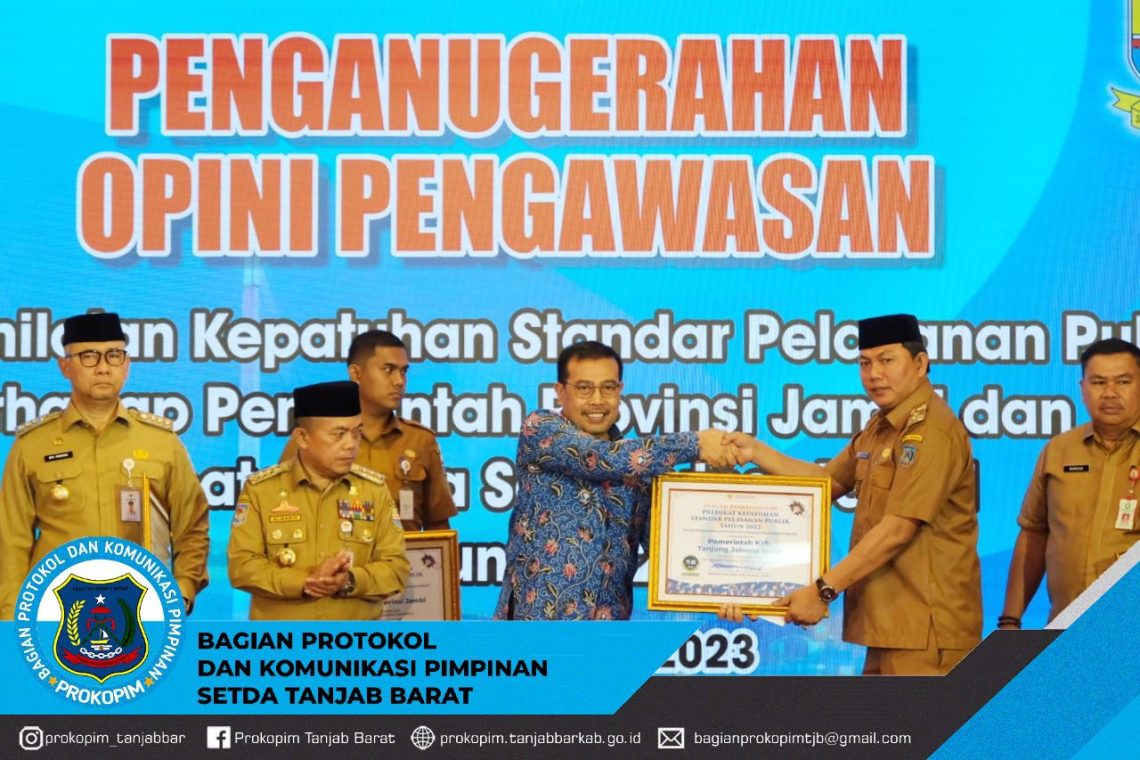 Tanjab Barat – Wakil Bupati Tanjab Barat H. Hairan S.H hadiri kegiatan penganugerahan penghargaan hasil penilian kepatuhan standar pelayanan publik oleh Ombudsman RI terhadap pemerintah provinsi jambi dan Kabupaten/Kota se Provinsi jambi tahun 2022. Selasa (31/1)
