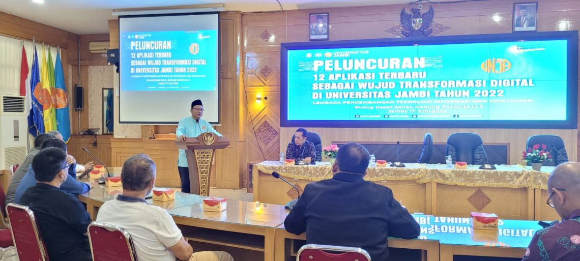 Mendalo – Lembaga pengembangan teknologi informasi dan komunikasi (LPTIK) Universitas Jambi (UNJA) meluncurkan 12 aplikasi terbaru sebagai wujud transformasi digital di Universitas Jambi tahun 2022 di Ruang Senat Gedung Rektorat Lantai III UNJA Mendalo, Jum`at (17/6/22).